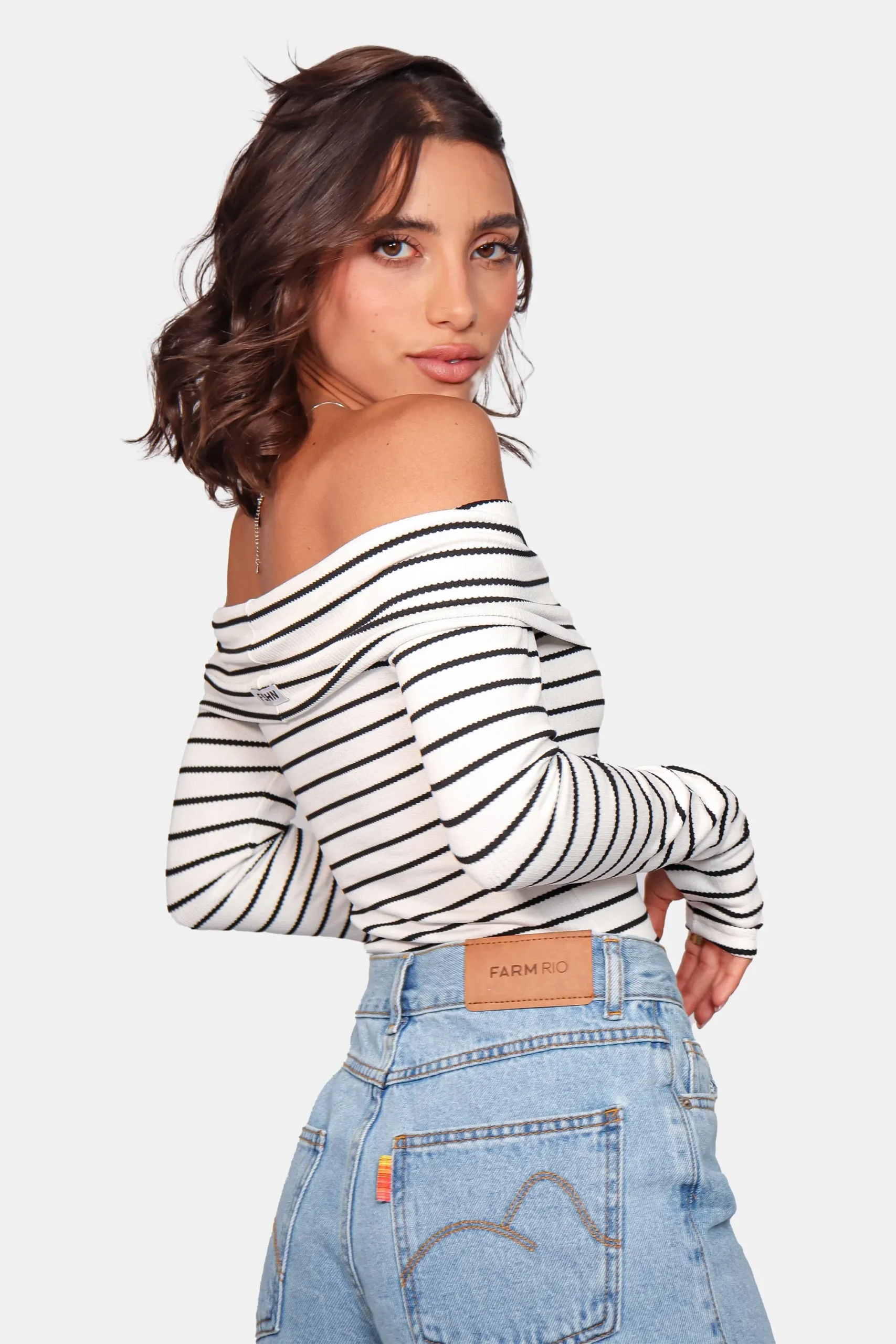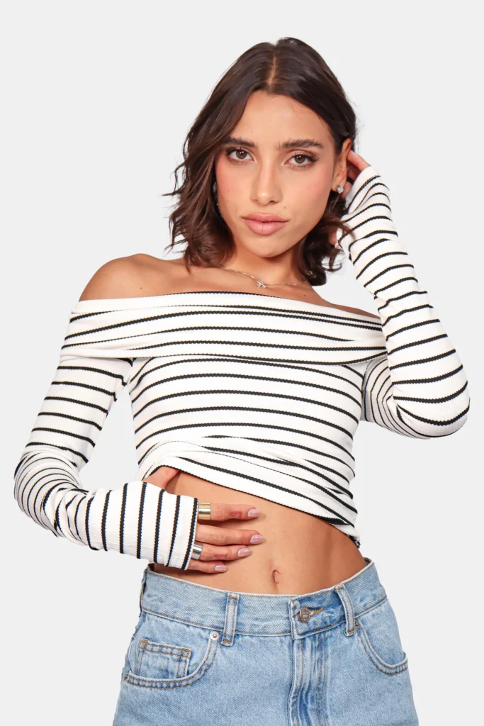 Blusa com estampa listada preto e braco com detalhes Retrô, mangas longa ee elegante.